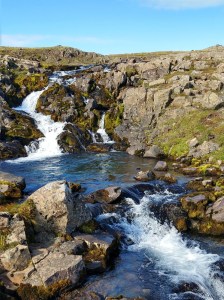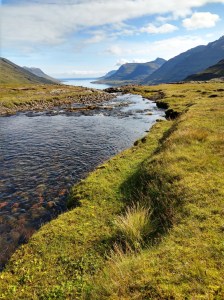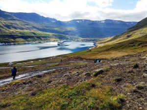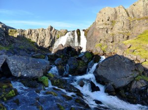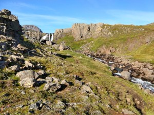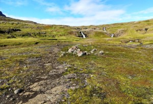 I quickly spotted the part of the trail that was “a bit steep”. It rose almost vertically above me. Muttering darkly about fit young men, and their perceptions of the capabilities of considerably older women who have been indulging in cruise ship cuisine, I proceeded to haul myself way upwards. After a while it levelled out and I was able to walk rather than clamber. It was beautiful up there – very alpine, even though we were not far above sea level. I saw Icelandic sheep, wildflowers – and waterfalls everywhere. Every few minutes I crossed a gully through which a stream flowed. Looking up to my left, there was always a cascade higher up. The camera was working overtime. I could still see right down the fjord, and over the town. One of the gullies was very steep and I had to bum slide down into it.