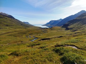 I duly set off as instructed, turning right at the fish factory and on to the trail, which was indicated by small yellow marker posts. It started off climbing gently, with a couple of small streams to cross. It was muddy in places but nothing too difficult. I reached the odd beehive-shaped sound sculpture in half an hour. I had lovely views back over the fjord.
