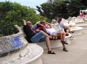 After taking three different metro lines to travel four stations, we felt like old hands. The stations are very hot, quite crowded, and BIG. Each one seems to have a complicated interchange with lots of stairs or escalators. It’s a quick but tiring way to get around. We duly found the Park Guell shuttle bus, which took us up the hill and dropped us at an entrance.