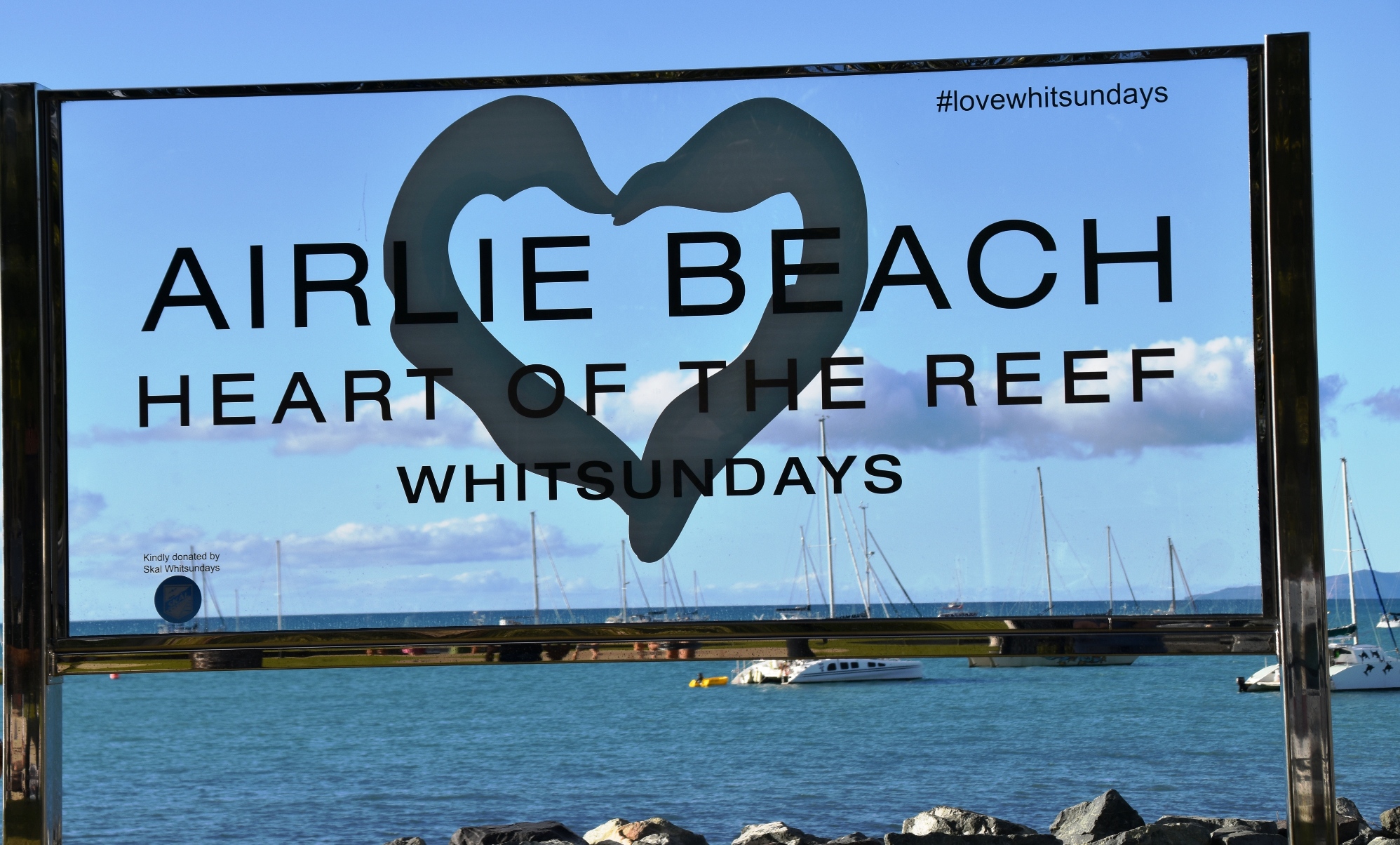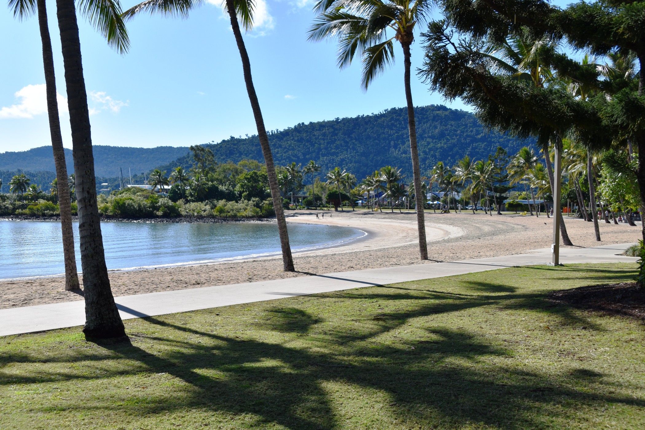 Our bags appeared in record time, and before long we were on board the shuttle bus to Airlie Beach. We disembarked in the centre of town, and were soon settling in to our holiday unit – selected for its proximity to the supermarket and the bus stop, rather than for anything sles – but so far it has proved comfortable and practical, with a serviceable kitchen and nice big bathroom. The back door opens straight out onto the beach.