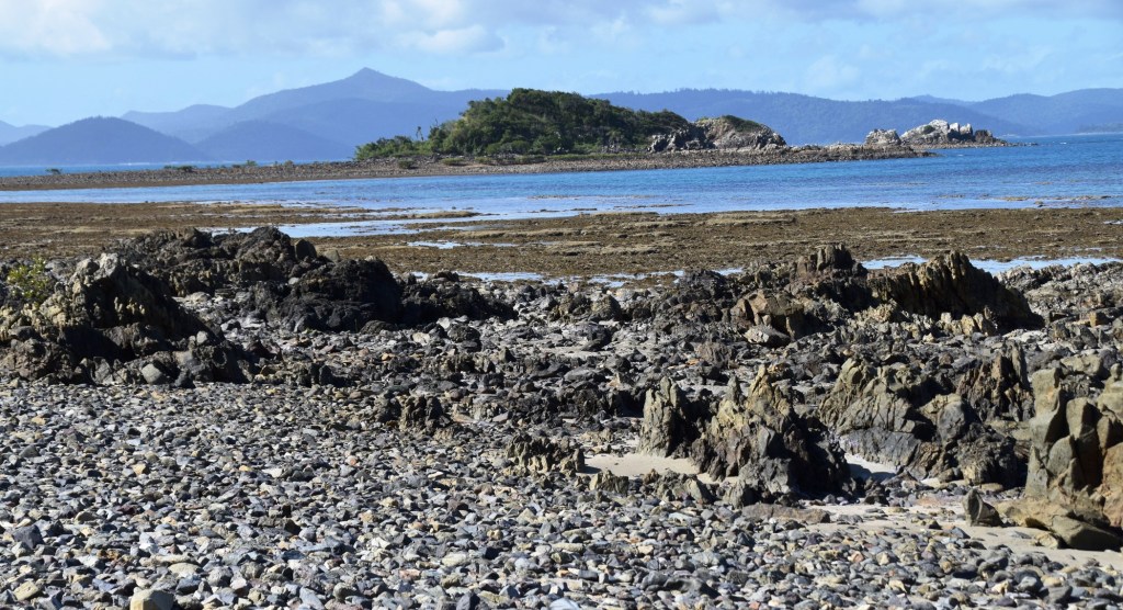 Island life runs slowly, and involves a lot of time gazing at the water, seeing where the tide is at, which boats are arriving, and making decisions about lunch. Hence our expedition party of two set off around 2-ish. The trail was hard packed dirt with rocky sections, and it was wide and well maintained. The first junction was reached quickly. To the east was Pandanus Bay, and to the west was Fish Beach. All the beaches on the eastern side are rocky, with very little or no sand. They feature craggy headlands, and wind-warped vegetation. On the western side, you get mangroves and dark sand. It’s quite unusual, as there is only 1-200 metres between east and west.