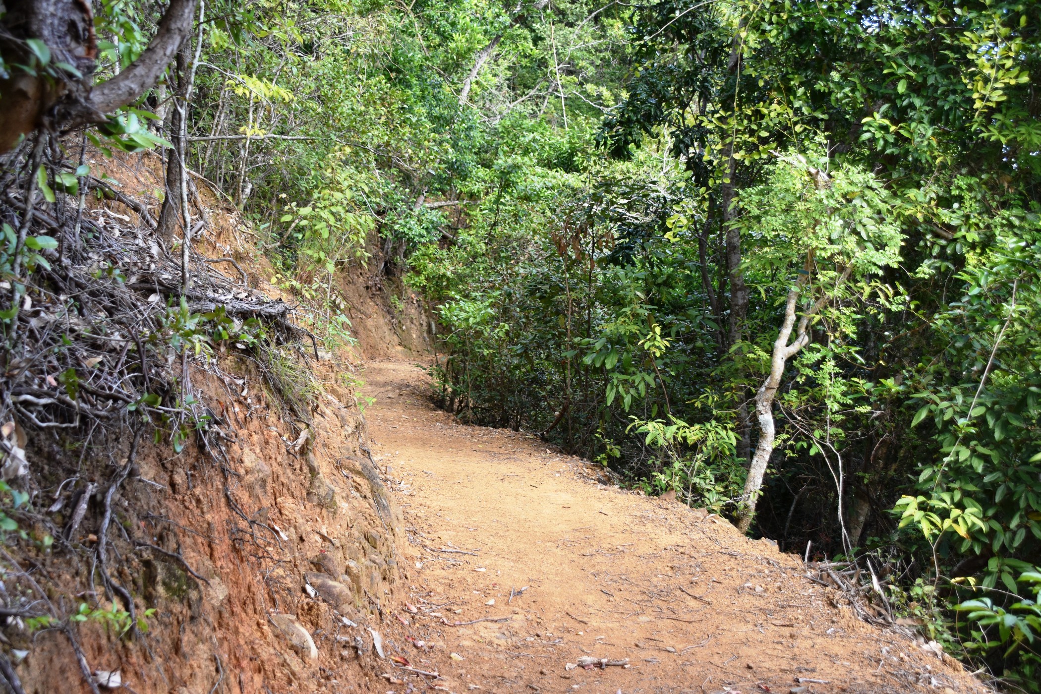 Pressing on, we detoured to Humpy Bay. This trail curled up the hill for a short distance, ending at a pile of rocks, but there were too many trees to get more than a glimpse of the water below. The final section led to Happy Bay, which is a now disused resort. From what Ian could see, the beach looked similar to ours at Palm Bay.