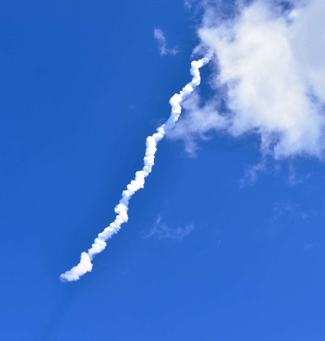 Before long we could see the first flames just above the treeline, then the Falcon 9 rocket came into view. Although we were several kilometres away, we could clearly see the distinctive outline as it climbed rapidly above the powerlines and into the clouds, leaving a vapour trail behind. It was invisible in a matter of seconds.
