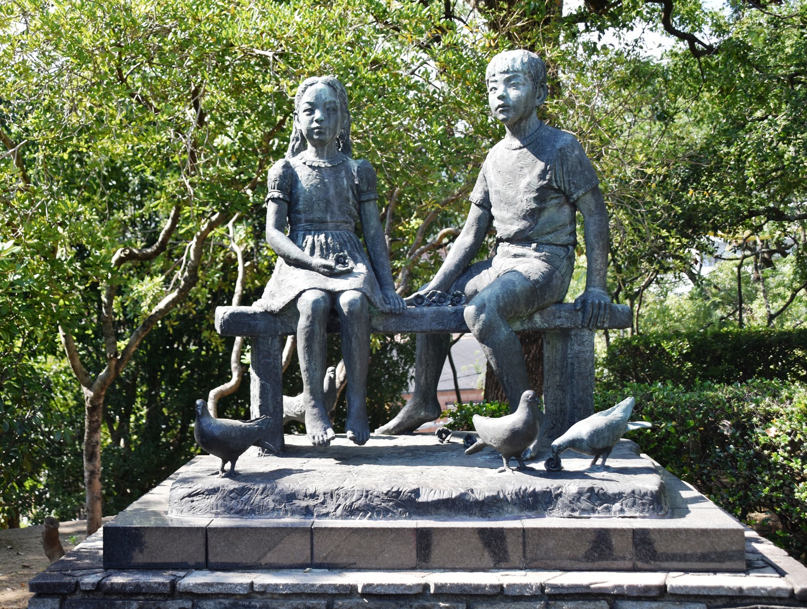 We boarded the tram for the first of several rides, and headed to the Peace Park. Here there is a garden, fountain, and numerous statues, many donated from other countries. It was a good spot for a rest in the shade, and some contemplation. Just across the road is the monument at Ground Zero, marking the exact spot where the bomb detonated 500 metres above (Ian is holding up 5 fingers in the photo, by way of explanation).