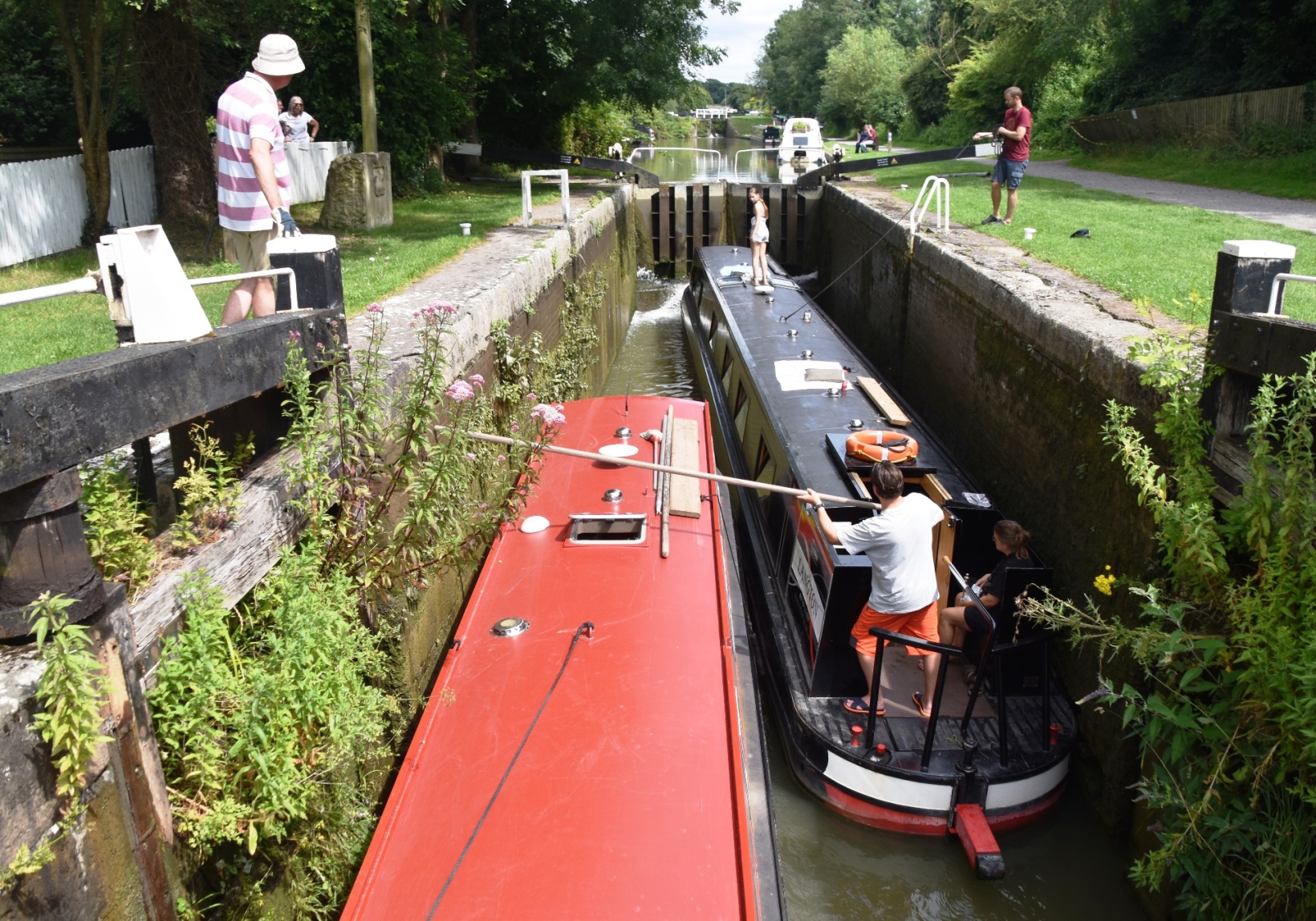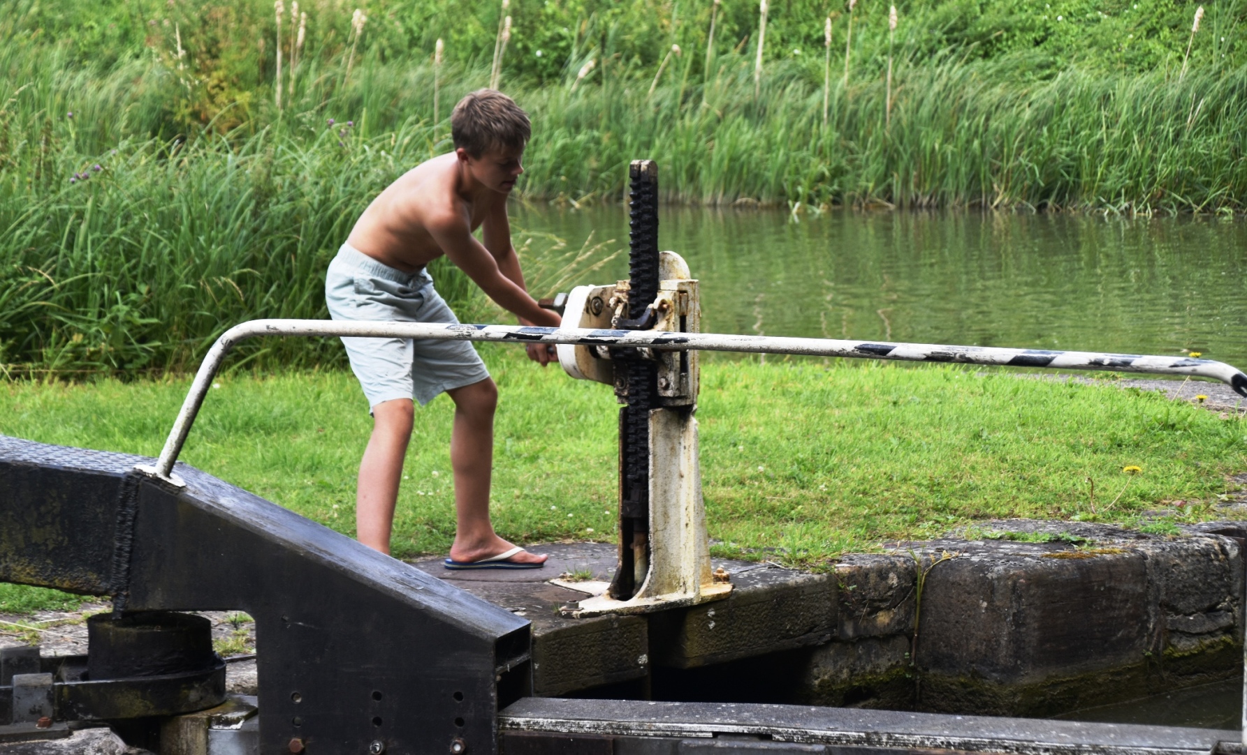 We timed it perfectly, arriving to see two boats tackling the locks together. One boat had two teenage boys who seemed keen to provide the muscle to open the gates. The girls took care of the ropework – a team effort. They had plenty of spectators, and Ian even helped swing one of the gates open. The locks fill surprisingly quickly, but it would be quite a concentrated effort to navigate them all, positioning the boat carefully each time.