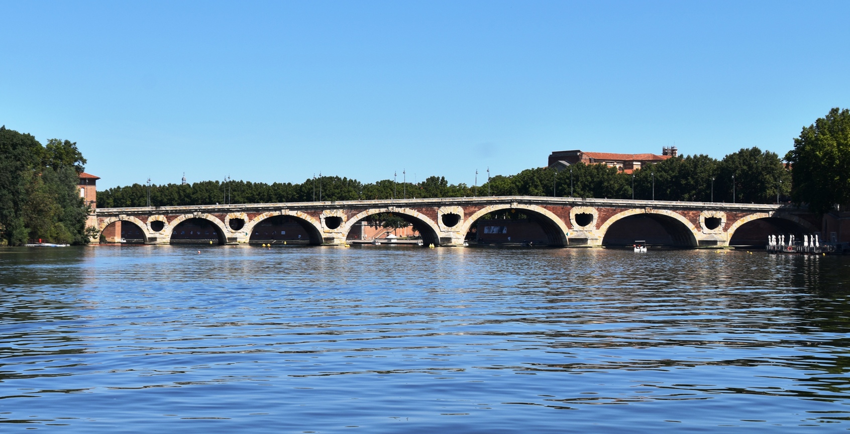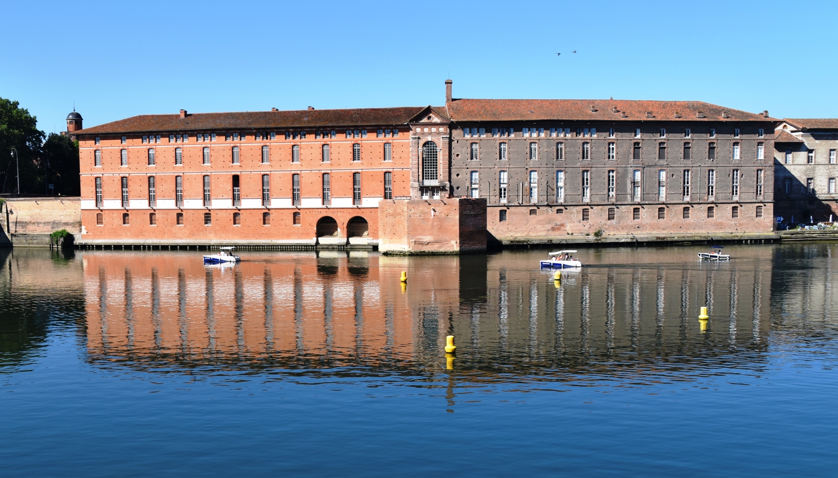 We turned around at the Ponts Jumeaux, a basin where three canals meet. If we’d turned hard right, we could have continued along the Canal du Midi, all the way to Sete on the Mediterranean. If we’d continued on the Garonne, we’d have ended up in Bordeaux and beyond, all the way to the Bay of Biscay. But alas, we turned around and went back the way we came. We had lovely views and reflections of the Pont Neuf and the Hopital La Grave.
