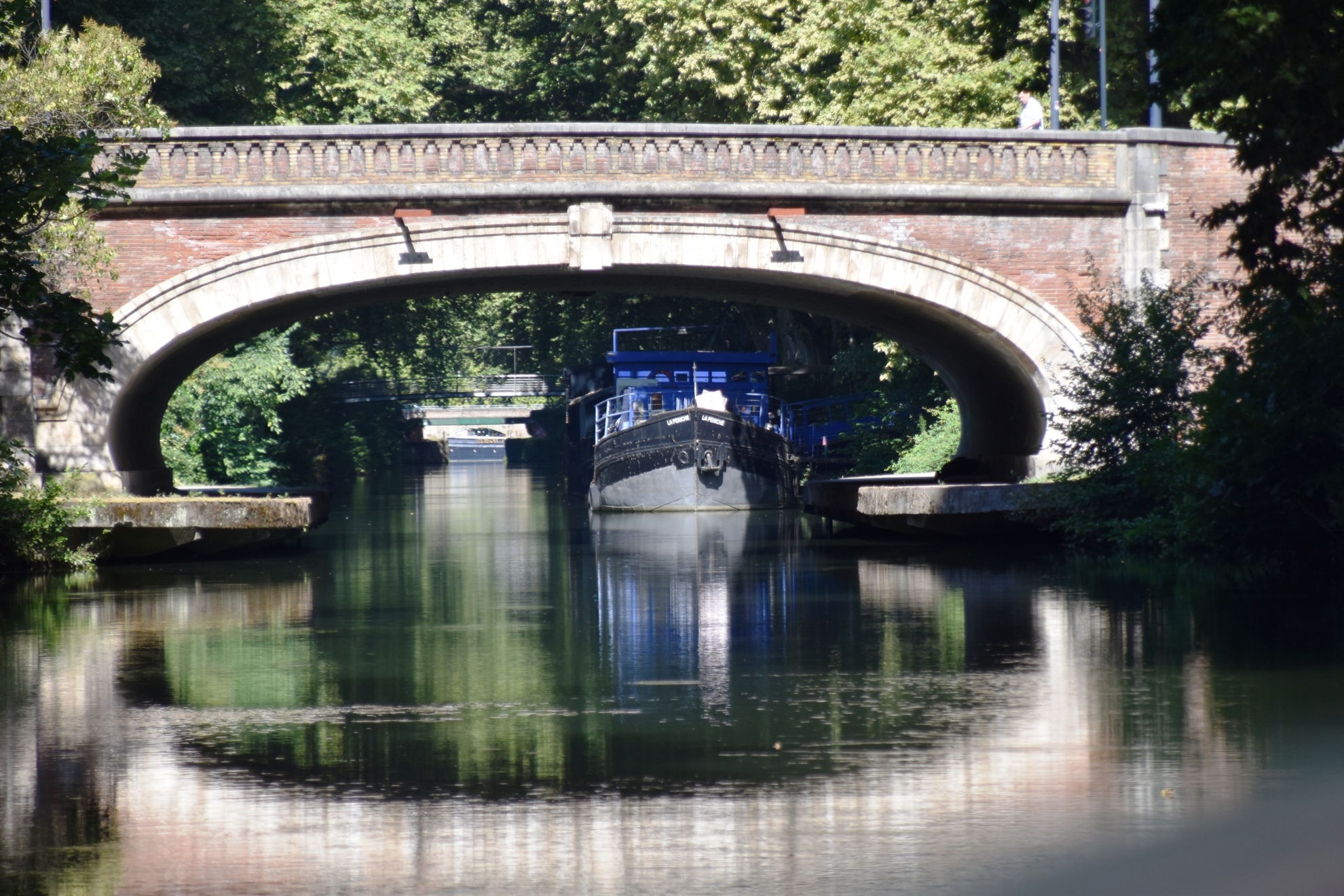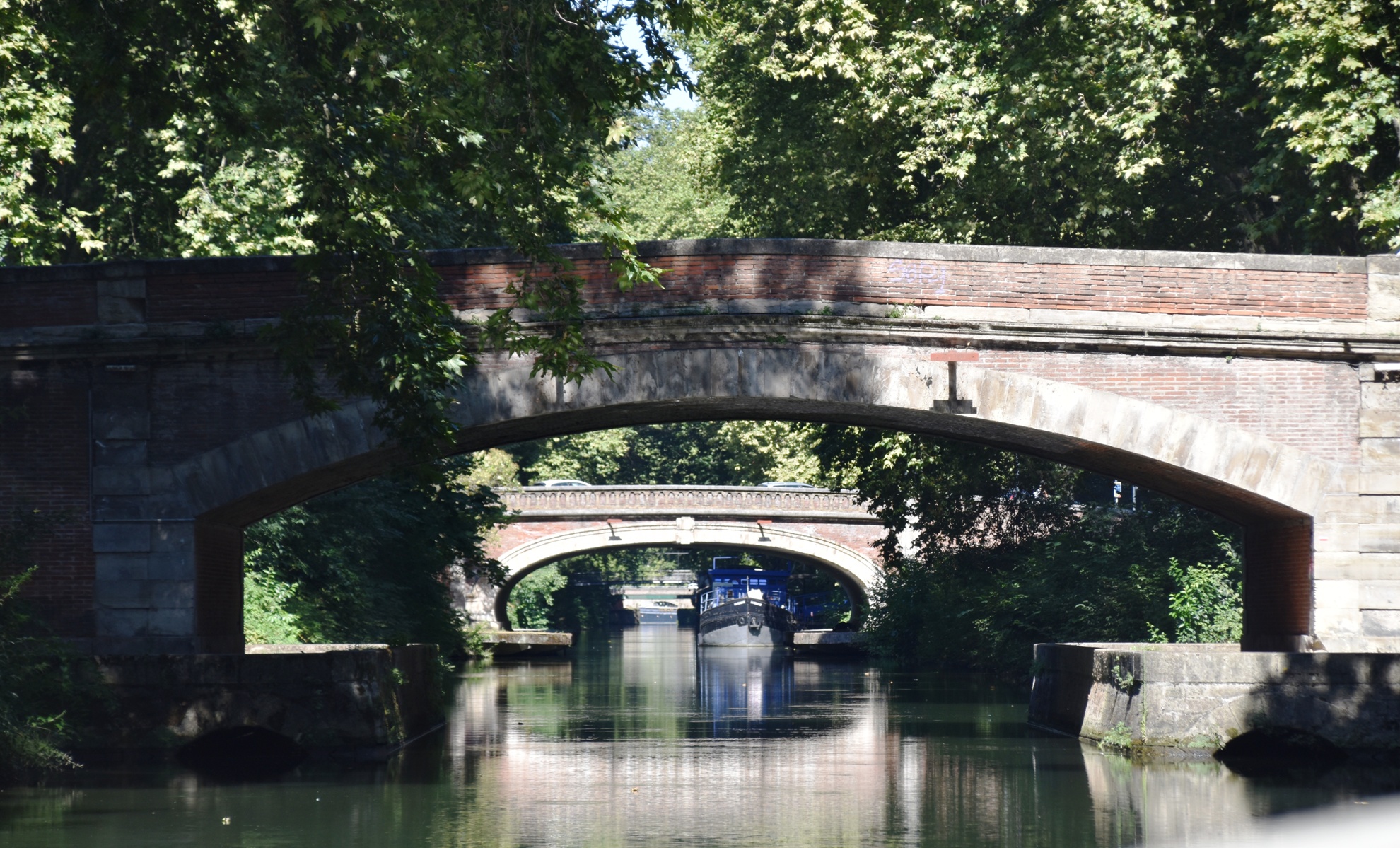 We found ourselves at Port de la Daurade, the historic port that nowadays is the place to board a bateaux for a canal cruise. We did exactly that, and spent a relaxing hour on the Garonne, then entering the Canal de Brienne via the St Pierre Lock. The water level either side of the steel gates is only about 10 cm different, so it doesn’t take long to move through, and up into the canal. Lined with plane trees the old towpaths, we noticed the narrowboats here are much larger than English ones; presumably the canals are more navigable.