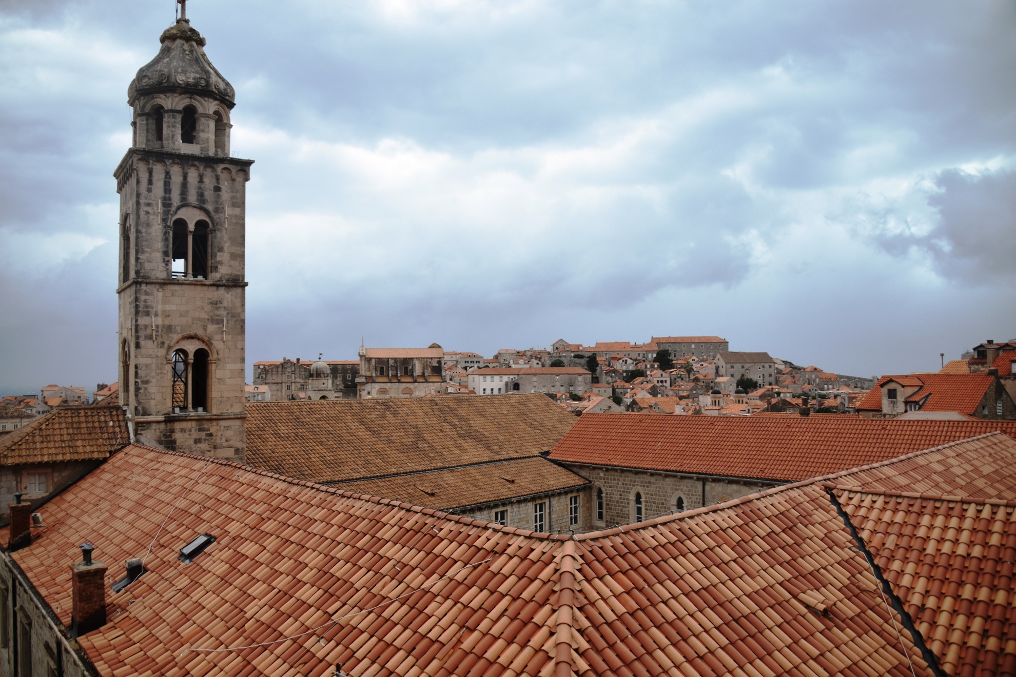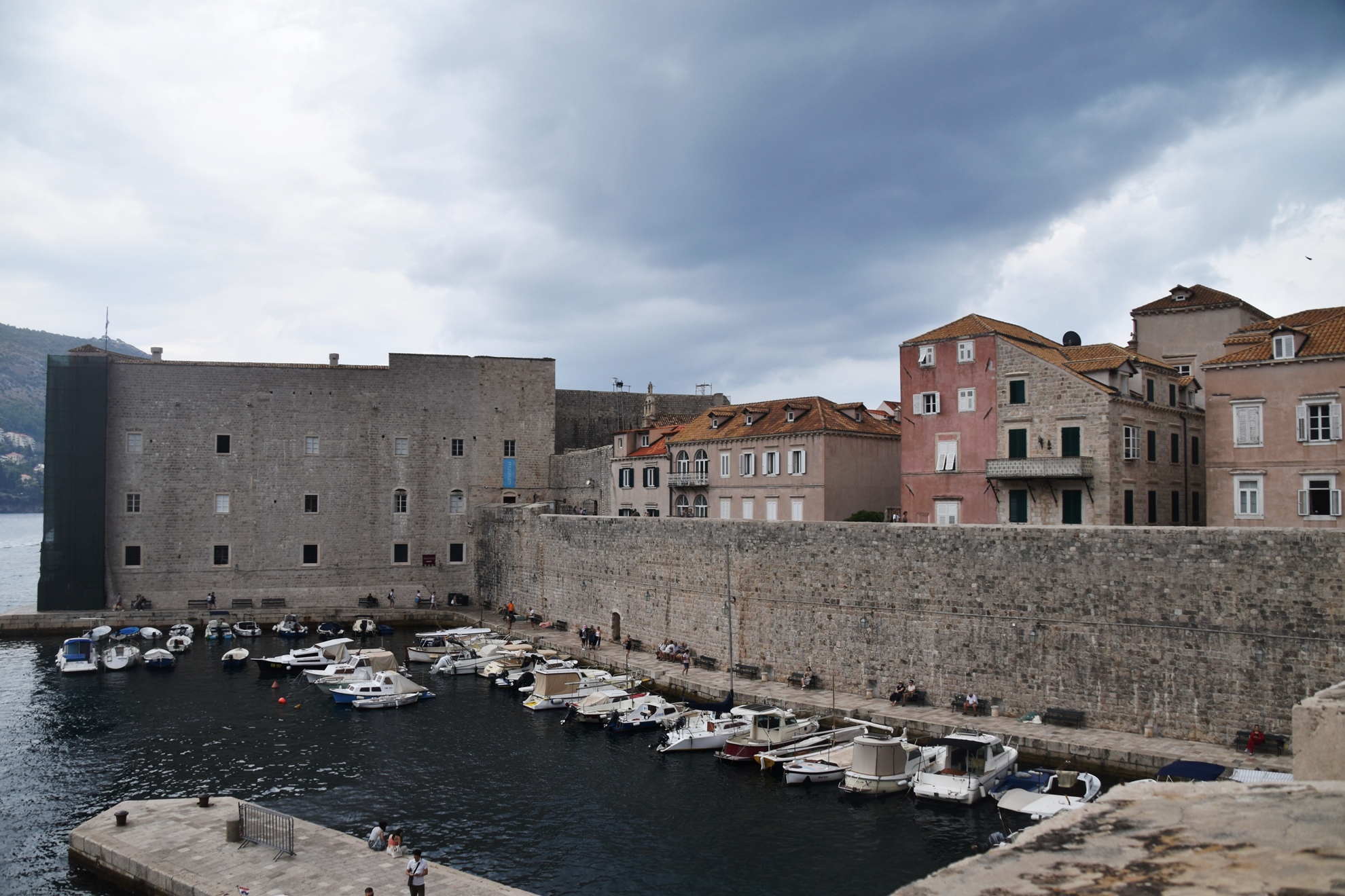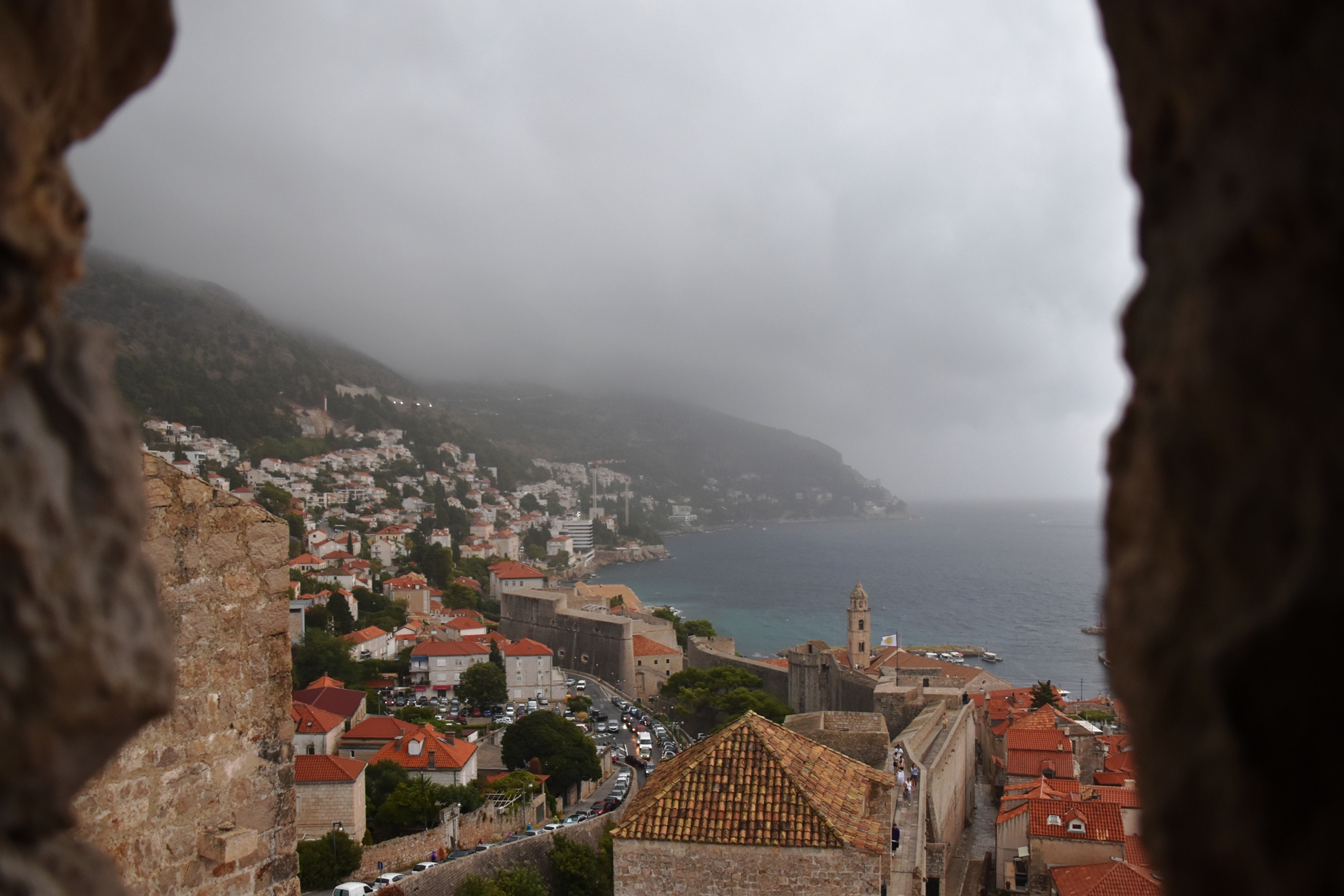 As most people know, Dubrovnik is one of the few places in the world where the walls are completely intact and walkable on the top. As we made our way around, negotiating a lot more steps, we had views across to Fort Lawrence, and then of the sheer section of wall which faces the sea. It was about then that we noticed some dark clouds hovering over the nearby island. We made it almost all the way around, but the downpour started just before we reached the last tower. We joined a lot of poncho-clad people sheltering inside the tower’s arch, all checking the rain radar on their phones.