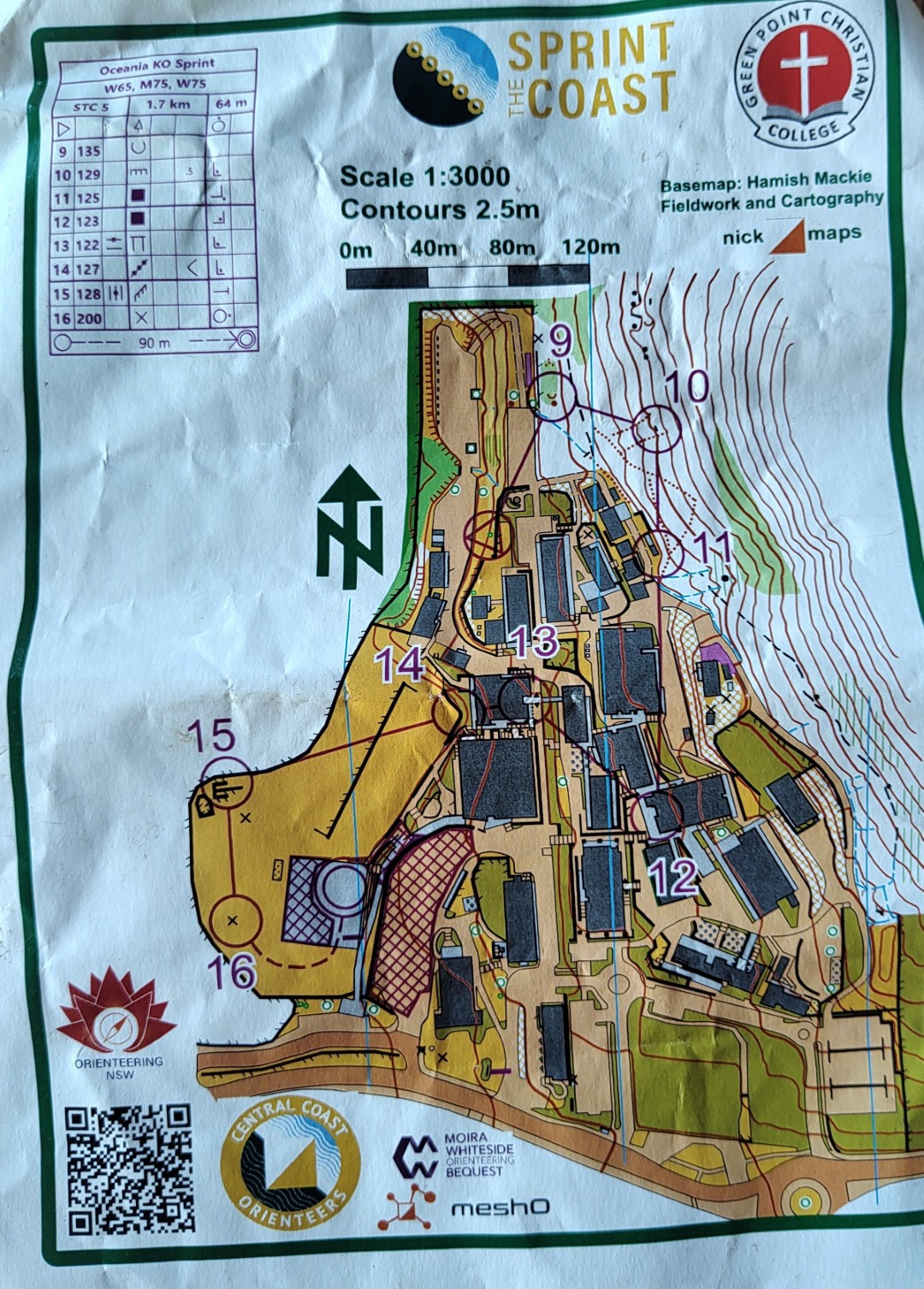 Then came the map flip. I had already seen people heading up the steep hill into the bush, but I was pretty sure that they wouldn’t send “the oldies” up there. How wrong I was. The first three controls after the flip – 9, 10 and 11 – were all on the scrubby, slippery slopes. The thing was, you could see the flags from the bottom, so there was absolutely no navigation at all, and I am still trying to figure out what purpose these controls served, in a sprint. There was plenty of campus that they could have used instead.