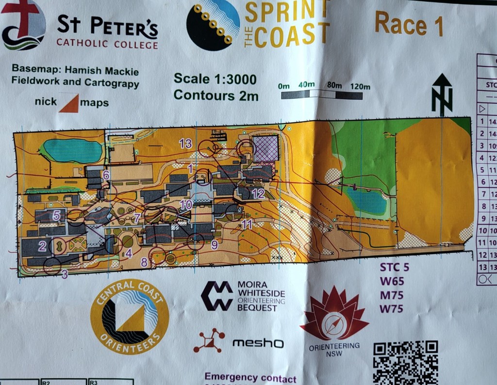 Race 1 was in Tuggerah, at a small school campus which featured multiple levels on a slope. There was plenty of complexity, with lots of stairs, ramps, canopies, small garden beds etc. Most courses had butterfly loops and map flips, to eke out the distance. My course, being the shortest, was all on one map, so there was a bit of visual disentangling needed to follow the red line. The map was readable and I thought the course setting was fair – tricky, but no traps. My plan was to find a feasible route and execute it correctly, rather than second guess myself looking for a slightly shorter way. It seemed to work, as I had a clean run except for my no 7, where I was too far west in an area with a lot of visible controls.